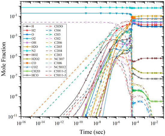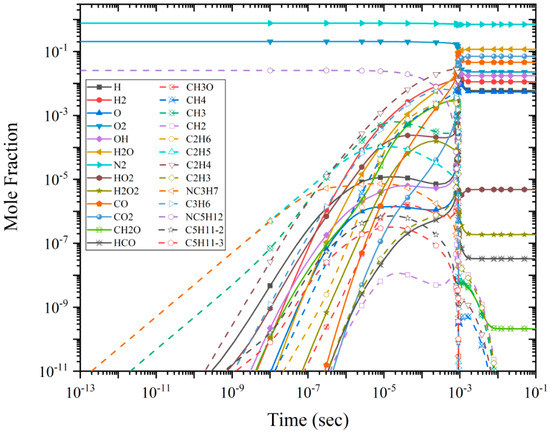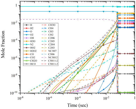 n-Pentane is the main component of light hydrocarbon gas, which is widely used in the research of Meng et al. [2]. In order to study the combustion process and characteristics of light hydrocarbon gas by CFD simulation, the detailed chemical kinetic mechanism of n-pentane needs to be simplified. The chemical mechanism of n-pentane has been studied and improved in the last few years. Knox and Kinnear [3] used gas chromatography to study the initial phase of the slow reaction of gaseous n-pentane with oxygen under static conditions at 523–673 K through analysis of the reaction products. Hughes et al. [4] studied the reaction of n-pentane with oxygen in the temperature range of 530–553 K, including the slow oxidation zone and the cold flame zone. Qualitative analysis showed that the relative importance of the various products obtained is consistent with the proposed reaction mechanism. Westbrook et al. [5] used a numerical model and detailed chemical kinetic reaction mechanism to study the oxidation reaction of n-pentane in a stirred reactor, including 53 chemical species and 326 basic reactions in a temperature range of 1068–1253 K and at atmospheric pressure. The results showed that the main reaction pathway of n-pentane is the extraction of H atoms by OH radicals, followed by the extraction of H atoms by H and O atoms, and the decomposition of single molecules to generate ethyl and n-propyl radicals. The oxidation reaction of n-pentane in a jet-stirred reactor in a temperature range of 950–1050 K, suitable for a wide range of fuel–oxygen equivalence ratios (0.2–2.0), was studied by Chakir et al. [6]. The results proved that there was a good agreement between the calculated and measured concentrations of the main chemicals. Bugler et al. [7] studied the ignition conditions of three pentane isomers under a wide range of temperatures and pressures, and compared the model simulation results with the experimental results performed with a shock tube. The results showed that the ignition delay time and pressure rise were very consistent in the first and second stage ignition events. Zhukov et al. [8] used a shock tube to determine the ignition delay time in an equivalence ratio of 0.5, temperatures of 867–1534 K, and pressures of 11–530 atm, and studied the effect of mixed pressures on ignition at temperatures of 1000–1100 K. The ignition delay times after reflecting shock waves at pressures of 2 to 20 atm, temperatures of 1100 to 1600 K, and a mixture ratio of 0% to 100% at equivalence ratio of 0.5 were measured by Jiang et al. [9]. The National University of Ireland (NUI), Galway pentane isomer model provides a good prediction of the ignition delay time of dimethyl ether, n-pentane, and their blends. In a wide range of equivalence ratios, at atmospheric pressure, and elevated unburned mixture temperatures, Ji et al. [10] measured the laminar flame speeds and extinction strain rates of premixed C5–C12n-alkane flames. Implementing innovative designs of high temperature, high pressure, and constant pressure combustion chamber environments and a nonlinear extrapolation method, Kelley et al. [11] determined the laminar flame velocities of C5–C8n-alkanes and air under high pressure and the high-fidelity experimental data of Markstein length from the propagation velocities of spark-ignited and expanding flames. Cheng et al. [12] investigated the laminar flame speeds of three pentene isomers and n-pentane through experiments and kinetic models. Rousso et al. [13] explored the chemical kinetics of low-temperature oxidation and pyrolysis of pentane under plasma-assisted conditions. In an atmospheric jet-stirred reactor, Zhao et al. [14] studied the low-temperature oxidation reaction of n-pentane by adding nitric oxide. Chen et al. [15] studied the co-pyrolytic mechanisms, kinetics, emissions, and products of sewage sludge and coffee grounds at 5 atm.
