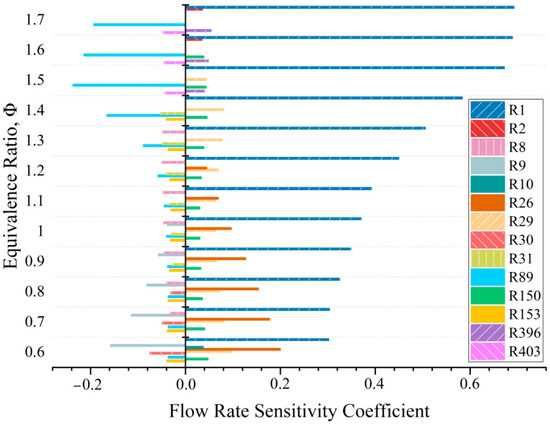 The flow rate sensitivity coefficients of laminar flame speed calculated with DGPA at an unburned gas temperature of 298 K and equivalent ratios of 0.6–1.7.