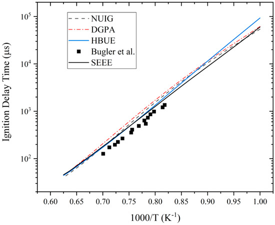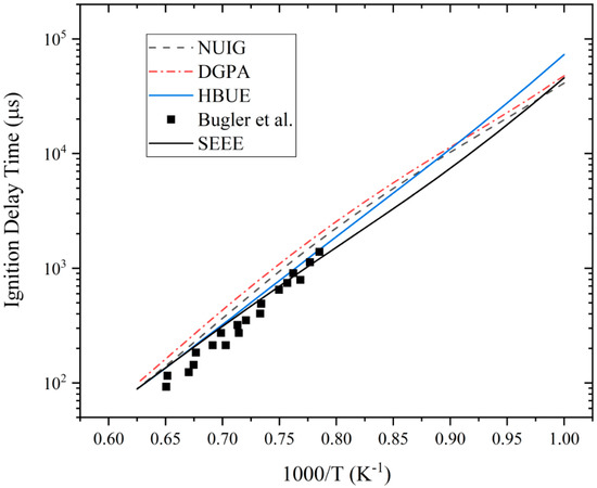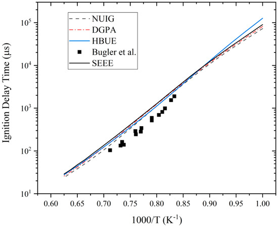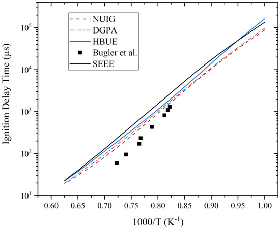 The experimental data of Bugler et al. of the ignition delay time for n-pentane/air mixtures at equivalence ratios of 0.3, 0.5, and 2.0 measured using the shock tube were presented [7]. Figure 6, Figure 7, Figure 8 and Figure 9 show the ignition delay times calculated using NUIG, DGPA, HBUE, SEEE, and the experimental data at temperatures of 1000–1600 K. The error analysis of Figure 6 is detailed in Section 2.4. Figure 7 shows the ignition delay times calculated using NUIG, DGPA, HBUE, SEEE, and the experimental data at an equivalence ratio of 0.3. Compared with NUIG, the average errors of HBUE and SEEE are 34.83% and 55.86%, respectively, and their corresponding maximum errors are 84.55% and 70.91%, respectively. Figure 8 shows the ignition delay times calculated using NUIG, DGPA, HBUE, SEEE, and the experimental data at an equivalence ratio of 0.5. Compared with NUIG, the average errors of HBUE and SEEE are 17.97% and 19.97%, respectively, and the maximum errors of them are 74.60% and 27.99%, respectively. Figure 9 shows the ignition delay times calculated using NUIG, DGPA, HBUE, SEEE, and the experimental data at an equivalence ratio of 2.0. Compared with NUIG, the average errors of HBUE and SEEE are 16.42% and 18.60%, respectively, and their corresponding maximum errors are 77.83% and 33.53%, respectively. In general, with the increase of the equivalence ratio, the variation curve of the ignition delay time of HBUE and SEEE with temperature shifts to near the NUIG and experimental data. That is to say, the ignition delay times predicted by SEEE at equivalence ratios of 0.5 to 2.0 are in good agreement with NUIG and experimental data, and the prediction of HBUE at 1100–1600 K is also good.