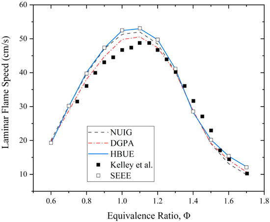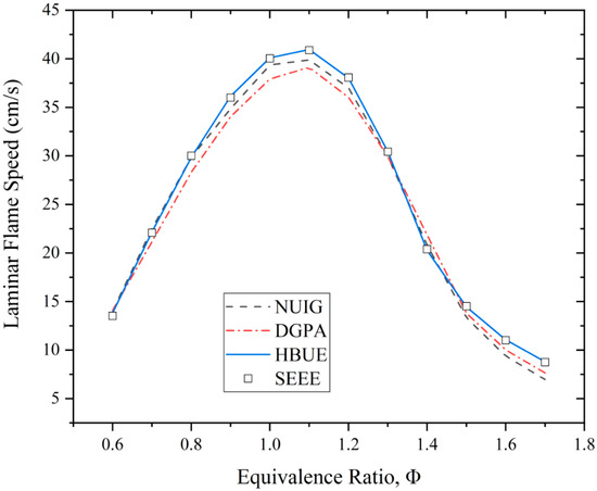 Comparison of the laminar flame speeds between NUIG, DGPA, HBUE, and SEEE at equivalence ratios of 0.6–1.7 and an unburned gas temperature of 298 K.