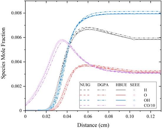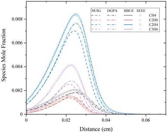 Species profiles are simulated using the premixed laminar burner-stabilized flame model with the mechanisms of NUIG, DGPA, HBUE, and SEEE at an equivalence ratio of 1.0 and an unburned gas temperature of 298 K. Figure 12 shows the concentration profiles of some key C1–C3 species, and Figure 13 shows the corresponding profiles for some key oxidation species involving H, O, OH, and CO. The predicted concentration of the key C1–C3 species with HBUE and SEEE is higher than that of NUIG as shown in Figure 12, but the overall change trend is consistent. This error can be expected due to the reduction of species in HBUE and SEEE, and the decomposition pathways of C1–C3 is different from that of NUIG. However, the concentration of smaller oxidation radicals is nearly identical, as shown in Figure 13.
