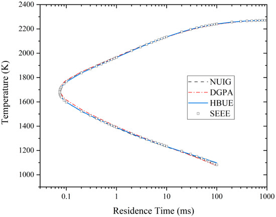 The extinction residence time [24,25] is an important parameter for verifying the performance of the chemical reaction mechanism. The perfectly stirred reactor (PSR) is used to determine the extinction limit by reducing the residence time until there is insufficient time to react. Figure 14 shows the relationship curves (C-curves) of the residence time and the temperature at an equivalent ratio of 1.0 and an initial temperature of 298 K calculated with NUIG, DGPA, HBUE, and SEEE. Compared with NUIG, the average errors of the temperatures predicted by HBUE and SEEE at different residence times are 0.30% and 0.25%, respectively, and their maximum errors are 1.77% and 0.79, respectively. The extinction temperature is defined as the characteristic temperature corresponding to the extinction residence time. According to the C-curve, each residence time corresponds to two temperatures, but the extinction limit only corresponds to one temperature. The extinction residence times calculated with NUIG, DGPA, HBUE, and SEEE are very close; therefore, the extinction temperature is used for comparison and verification. Figure 15 shows the extinction temperatures predicted by NUIG, DGPA, HBUE, and SEEE at equivalent ratios of 0.5–1.6. Compared with NUIG, the average errors of HBUE and SEEE are 0.61% and 0.60%, respectively, and their maximum errors are 1.15% and 1.15%, respectively. This indicates that HBUE and SEEE still have a very good performance in the prediction of unsteady combustion.
