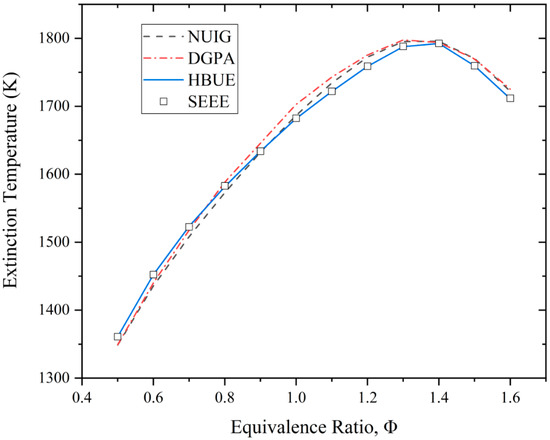 Comparison of the extinction temperatures between NUIG, DGPA, HBUE, and SEEE at equivalence ratios of 1.0 and an initial temperature of 298 K.