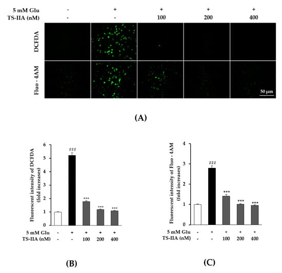 To assess the increase in ROS, we applied the method of Soo Yeon Choi et al. (2018) with a few adjustments []. After treatment with the specified concentrations of TS-IIA in the presence or absence of 5 mM glutamate for 10 h, the cells were exposed to 10 µM 2′, 7′-dichlorofluorescein diacetate (DCFDA; Sigma-Aldrich, St. Louis, MO, USA) for 30 min and then washed three times with phosphate buffered saline (PBS) to remove the unbound dye. The fluorescent intensity (excitation = 485 nm; emission = 530 nm) was analyzed using a microplate reader (SPARK 10 M; Tecan, Männedorf, Switzerland). In addition, we also observed the fluorescence intensity of each group using the fluorescence microscope IX51 (Olympus, Tokyo, Japan) connected to a charge-coupled device (CCD) camera.