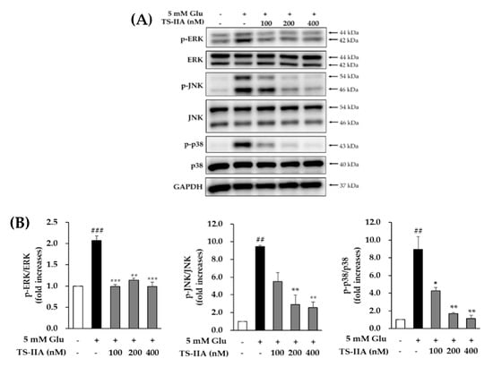 MAPKs consist of mitogen-activated protein kinases (p38), extracellular signal-regulated kinases (ERK), and c-Jun N-terminal kinases (JNK) that contribute to various cellular functions (apoptosis, differentiation, mitosis, proliferation, cell survival, and gene expression) and responses (proinflammatory cytokines, heat shock, mitogens, and osmotic stress) []. The phosphorylation of MAPKs associated with oxidative stress promotes several neurological disorders such as ALS, PD, and AD []. Furthermore, the previous study showed that MAPKs also were phosphorylated, following a glutamate-induced oxytosis in HT-22 cells []. In addition, Fukui et al. (2009, 2010) indicated that treatment with SB202190 (p38 inhibitor), SP600125 (JNK inhibitor), and U0126 (ERK inhibitor) inhibited cytotoxicity in a dose-dependent manner caused by glutamate in HT-22 cells [,]. Therefore, the attenuation of MAPKs phosphorylation could be considered a typical modulator of neuroprotective effect related in glutamate-induced oxidative stress. An immunoblotting analysis was used to study the effect of TS-IIA on the phosphorylation of MAPKs consisting of p38, ERK, and JNK. After exposure to the indicated concentrations of TS-IIA and 5 mM glutamate for 12 h, HT-22 cells were harvested, and western blotting was performed to determine the relative levels of proteins. The obtained data indicated that the phosphorylation of p38, JNK, and ERK was increased significantly in cells treated with glutamate but reduced substantially in cells treated with TS-IIA (Figure 4). These figures confirmed that the inhibition of MAPKs phosphorylation was the basis of the protection effect of TS-IIA against oxytosis caused by excess glutamate.