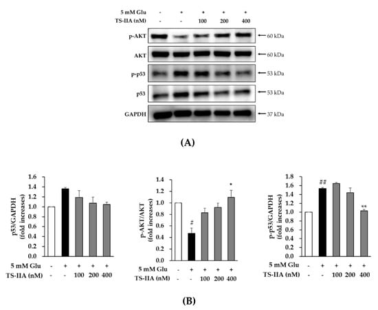 Moreover, previous studies showed that glutamate induced apoptosis through activating p53 [] and inhibiting the PI3K/Akt signaling pathway []. Therefore, we studied the antiapoptotic effect of TS-IIA by examining the relative levels of phospho-Akt, p53, and phospho-p53. As shown in Figure 5, the signal for phospho-Akt was decreased in the glutamate-treated group and increased in the presence of TS-IIA. In contrast to the trend in the phosphorylation of Akt, glutamate increased the expression of phospho-p53 and p53, which was decreased in the TS-IIA-treated groups. These immunoblotting data proved that TS-IIA protected HT-22 hippocampal cells against glutamate-induced programed cell death through the activation of Akt, which led to the inhibition of p53 activation and phosphorylation.