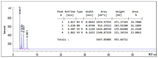 For the chromatogram of the final surfactant product in Figure 2, it revealed that besides the oleic amido betaine, the surfactant also consists of a significant amount of intermediate as well as some compounds produced from the reaction, evidenced by the other intense peaks in the same figure. The presence of intermediate was confirmed based on its individual retention time at 4.407 min, which shifted slightly to the right from its individual chromatogram. The most intense peak eluted at the retention time of 2.817 min belonged to sodium oleate based on its individual reference compound analyzed using this method, as shown in Figure A3. The retention time at 3.63 min was attributable to the sodium chloroacetate, as shown in the chromatogram in Figure A4 in Appendix A.