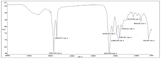 As presented in Figure 3, the formation of oleic amido betaine was further confirmed with the presence of the peak at 1392.87 cm−1 attributable to the COO-peak, indicating the formation of the carboxylate head from the oleic amido betaine itself or the fatty acid salt that was formed along with the reaction. The next significant peaks observed were the several peaks that belonged to the amide in the spectrum. The peak at 3294.75 cm−1 indicated the formation of secondary amide (N-H); and the peak at 1633.94 cm−1 indicated that the presence of (C=O) belonged to the amide functional group. The formation of amide was also supported by the presence of the peaks at 1549.25 cm−1 and 1464.28 cm−1, attributed to secondary amide (N-H bending) and C-N stretch, respectively.