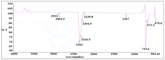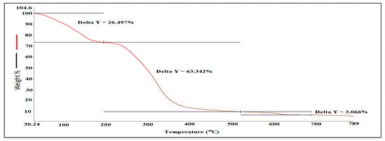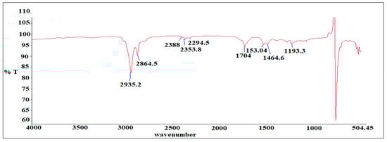 The hyphenated TGA-IR method gives the proposition of component loss versus the possible functional groups. It can be a tool to confirm the presence or absence of certain components at specific decomposition temperatures. In this study, TG-IR was used to determine the conversion rate of the process based on the maximum decomposition of the surfactant and the decomposition after the maximum curve in the TG. Three mass loss regions were detected in the TG section, as shown in Figure 4 and the mass loss values are tabulated in Table 4. The first region in which the decomposition started from ambient to about 201.2 °C had 26.46% mass loss, corresponding to the loss of weakly bonded water as well as the loss of the unreacted elements such as sodium chloroacetate from the quaternization process. The decomposition was suspected at this temperature range based on its boiling point. Another decomposed product at this temperature range was fatty amide from the intermediate reaction. This statement was supported by the presence of small peaks in the IR curve in Figure 5 at 3707 cm−1 and 1194.2 cm−1, representing the O-H bond due to water, and the C-N (stretch) as the breakdown of the amide, respectively.