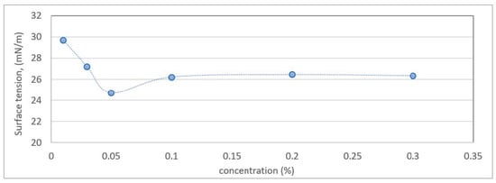 Figure 8 shows the surface tension of the as-synthesized surfactant solution at different concentrations. The critical micelle concentration is usually obtained from the intercept between the descending slope and the horizontal line in the surface tension plots against the concentration [18]. However, through this analysis, we found that the surfactant gave the lowest surface tension value of 24.7 mN/m at a concentration of 0.05wt.%. The surface tension increased when the concentration was increased to 0.1 wt.%. This finding was different from the surface tension curve of pure single surfactant that supposedly became levelled after the point of CMC. The reason for the different behavior of this surfactant could be due to the significant presence of associative mixtures, normally assumed as impurities. This finding was in agreement with the work done by [19] whereby the impure sodium dodecyl sulfate was used, and the similar trend of surface tension and point of CMC was observed. It was suspected that the impurities adsorbed at the air–water with higher surface activity than the surfactant itself. As for the as-synthesized surfactant, the phenomena could be due to the mixture of unreacted elements like amide as well as the presence of inorganic salts from the synthesis process [20].