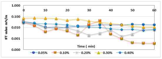 The dynamic IFT analysis was performed for the as-synthesized surfactant in seawater and the crude oil from Field A at the field temperature of 96 °C. The as-synthesized surfactant was regarded as 100wt.% active and was dissolved directly in seawater at different concentrations. No phase separation was observed during the IFT measurements at 96 °C and the analysis was carried out for all the concentrations in the range of 0.05 wt.% to 0.4 wt.%. The results are presented in Figure 9. At 60 min, the IFT was 3.4 × 10−4 mN/m, the lowest value recorded for 0.1 wt.% surfactant concentration. At this concentration, the dynamic IFT showed some instability, which might be due to the adsorption of the surfactant at the interface of crude oil and seawater, and/or the diffusion of surfactant back into the bulk solution [1,21].