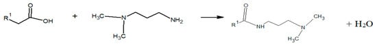 The surfactant was synthesized in a two-step reaction. In the first step, 0.125 mol of oleic acid was added into 100 mL reaction vessel, then 0.125 mol of N, N dimethyl trimethylethylene diamine was added to the oleic acid with continuous stirring at 100 rpm. The temperature of the synthesis was elevated to 120 °C and maintained at this temperature for 8–12 h under reflux. The water produced was collected during the reaction. The liquid product was then dried in a vacuum oven at 60 °C overnight or longer to further vaporize the excessive water. The amidation reaction is shown in Scheme 1.