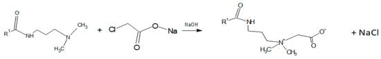 A quantity of 0.1 mol of amidation product was added into a two-pieces 100 mL reaction vessel placed in an automated synthesis reactor of the Mettler Toledo Easymax 402 system. Then, 0.1 mol of sodium chloroacetate (99%) was added into the product from the first step with continuous stirring at 400 rpm. NaOH was added dropwise, and the pH of the surfactant was maintained at 8–9. The temperature of the synthesis was set to 120 °C for 12 h, and the reaction was left unattended. No further purification was carried out for the semi-solid surfactant produced. The schematic representation of the quaternization reaction is proposed below in Scheme 2.