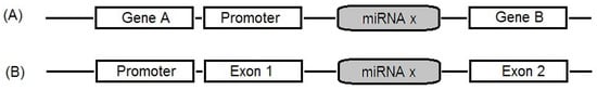 Location of the microRNA (miRNAs) gene in the genome: (A) intergenic miRNAs: miRNAs located between two genes; (B) intronic miRNA: miRNAs located in the region of intron in a gene.