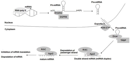 The biogenesis of miRNAs is classified into two categories: the canonical pathway and non-canonical pathway. In the canonical pathway, the primary miRNAs (pri-miRNAs) are transcribed from their genes and cleaved into pre-miRNAs by two main enzymes, Drosha and Dicer []. In this dominant pathway, the biogenesis of miRNAs, as well as the mechanism of regulation of their target genes’ expression, is summarized in the steps shown in Figure 2. The mature miRNA originates from a long primary miRNA (pri-miRNA) with the structure of 5′-7 methyl-guanosine capped and 3′ polyadenylated, and it is transcribed by RNA-polymerase II (RNA-polyII) from its own promoter or the promoter of the host genes in which it is contained; it is controlled by RNA-polyII-associated transcription factors and epigenetic regulators [,,]. Pri-miRNA contains a hair-spin structure which varies from hundreds to thousands of base pairs in length [,]. Pri-miRNA is cleaved at the stem of the hair-spin structure, leading to the release of a ~60–70 nucleotide hair-spin structure, which is termed as the precursor miRNA (pre-miRNA). This process is catalyzed by the microprocessor, which contains the nuclear RNAse III-type protein Drosha and its cofactor, the DiGeorge syndrome critical region eight (DGCR8) protein found in humans, and takes place in the nucleus []. The pre-miRNA with a stem-loop structure is exported from the nucleus into the cytoplasm for further processing by exportin-5 (EXP 5), originally known as a minor export factor for tRNAs, and the Ras-related nuclear protein guanosine triphosphate (RAN-GTP) [,,]. Then, the terminal loop of the pre-miRNA is removed by RNA III Dicer and its cofactor transactivation-responsive RNA-binding protein (TRBP), thereby releasing a ~20–22 nucleotide miRNA-duplex, which contains two 5′ phosphorylated sequence strands with 3′ overhangs, named the mature miRNA guide strand (miRNA) and complementary passenger strand (miRNA*) [,]. The miRNA-duplex is loaded into an Argonaute protein (Ago protein) to generate a RNA-induced silencing complex (RISC), and the miRNA passenger is degraded. The mature miRNA is incorporated into the miRNA-induced silencing complex (miRISC), which participates in regulating the gene expression via the interaction between a region called the “seed” (2–8 nt), a site located at the 5′ part of miRNA (positions 2–7) and the target mRNAs 3′-UTR by a Watson–Crick complementary sequence, leading to the degradation of the mRNA (in case of perfect pairing between the miRNAs/mRNA target) or the blocking of mRNA translation (in case of imperfect pairing (Figure 3)) [,,]. Up to date, some miRNAs are generated by different non-canonical pathways, including: (1) miTrons (pri-miRNAs are encoded in the introns of coding genes); (2) Dicer-independent miRNAs; (3) tRNA-derived miRNAs []. These non-canonical pathways use many different combinations of proteins which are involved in another pathway—the canonical pathway, including Dicer, exportin-5 and AGO2. It is noted that the Dicer protein is necessary in both canonical and non-canonical pathways, while Drosha and DGCR8 are only functioned to canonical miRNAs. In other words, the non-canonical miRNAs could be generated in the case of a Drosha and DGCR8 absence [].