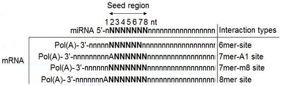 The interaction types of miRNA–mRNA (target mRNA). Site matching between the seed region of miRNA (at positions 2–8) and the 3′-end of the target mRNA. The character of N represents the single Watson–Crick paring nucleotide. Pol(A): Poly-A tail; A: Adenine.