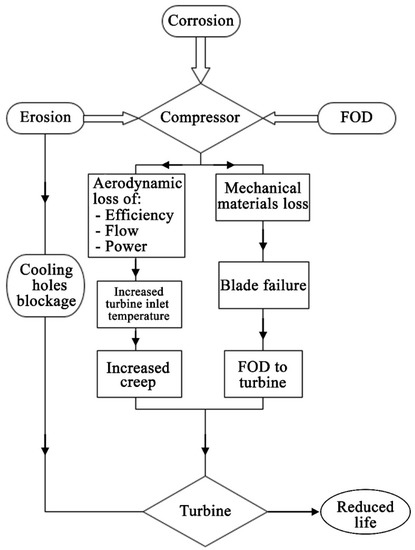 The demand for energy is rising globally due to economic and population growth. Concerns regarding energy security will also grow as more energy resources are required. As a result, the performance criteria of modern machines and cycles must be ever more rigorously defined in terms of pushing components to the limit of their capabilities [1]. The gas turbine engine (GTEs) industry is a crucial contributor to the global economy and has seen continuous growth since its early years [2,3]. GTEs are widely employed in propulsion and power generation in ships, aircraft, and industry because of their ability to operate in a wide range of environmental conditions and with high operating efficiency. The engine functions by exchanging the combustion heat energy into mechanical work which is achieved through means of a working fluid (air in most cases). Concerns for GTE life cycle management includes maintenance and operating costs, reliability, and availability of replacement parts [4,5,6,7]. Modern operating concepts require GTEs to operate with the highest performance factors while also complying with the environmental regulations and being operational feasible. The availability and performance of GTEs can be improved through an understanding of the mechanisms that contribute to the degradation of components. This will help recognise the causes of reduced performance and should significantly reduce the cost of operation. Availability of advanced numerical computational techniques improves design capabilities, enabling identification of loss generating flow patterns and the introduction of relevant degradation tolerances in the design of future components [8]. Knowledge of the operating conditions of GTEs is essential for assessing operational efficiency, performing diagnosis of the engine deterioration, and permitting an early prediction of the failures. In most cases, the GTE components gets exposed to harsh operating environments, which leads to degradation in its overall performance over time [9]. Such degradation in the components can result from various factors such as (1) erosion due to ingestion of particles, (2) fouling (3) hot corrosion/oxidation, (4) corrosion, and (5) foreign object damages (FOD) [10]. A comprehensive review of the research into turbomachinery deterioration was previously presented by Hamed et al. [11], where they concluded that the deterioration factors in turbomachinery components accompany performance loss of the system. In particular, the compressors can undergo various geometric modifications due to erosive degradation such as increases in tip clearance, blade chord reductions, increase in pressure losses due to increased roughness of the surfaces, and increased sharpness of the trailing edge. An example of the materials used in manufacturing compressor blades, their applications, advantages, and disadvantages are shown in Table 1. In GTs, the impact of particles with high velocities and of diameters more than about 10 microns on the leading edges of aerofoils, and other surfaces often causes deposition or erosion depending on the balance of molten versus hard particles [11]. It can be seen in Figure 1 how degradation can affect compressor and turbine blades, while Figure 2 demonstrates the interdependency of degradation phenomena in GTEs, as described by Saravanamutto [12].