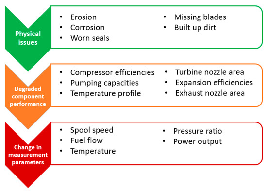 It is essential that any device associated with a GTE be maintained effectively to ensure a high level of reliability, and Figure 3 illustrates one approach to diagnose GTE defects. Hanachi et al. [22] demonstrated that a dominant performance deterioration mode was a result of congestion and airborne deposition foulants in the GTE upstream stages which led to decreases in compressor mass flow capacity, and an increase in GTE fuel consumption. Kurz and Brun [23,24] and Meher-Homji et al. [25] have proposed critical deterioration mechanisms, and concluded that the causes of the degredation of a GTE can be classed in two major categories: