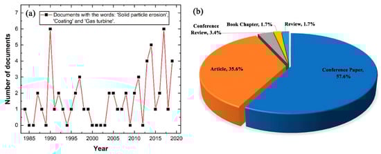 A measure of the relevance of the use of SPE protective coatings for GTEs can be obtained from a survey of published works. According to the Scopus database, there are at the time of writing 4015 papers on SPE (1957–2019), of which only 58 cover the implementation of coatings for GTEs (1984–2019) [36]. Figure 4a shows the number of published documents on SPE protective coatings for GTEs per year, while Figure 4b demonstrates the percentage of each type of these documents. The results from Scopus were obtained by first searching for “Solid particle erosion”, then carrying out a second search on the results obtained for “Coating” and “Gas turbine”.