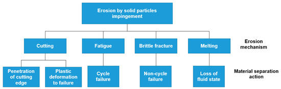 As mentioned previously, SPE is a material removal phenomenon that the targeted material surface experiences due to the repeated impact on it from differing sized solid particles of high striking speeds [37]. Furthermore, the kinetic energy (KE) of these particles should be high enough to cause structural damage to the contacted material surface. For instance, particles smaller than 10 µm, in contrast to those of larger sizes, usually do not possess sufficient KE to erode the blades [18]. The medium itself, in which the solid particles flow to cause surface erosion, can be of gaseous or liquid phase [38,39]. Meng and Ludema [40] illustrated in their work the impingement concept of SPE, where they explained that this particular type of erosion occurs due to a number of changeable permutations of brittle fracture, cutting, fatigue, and melting. Figure 5 shows the four mechanisms of SPE and their associated material behaviour. In addition, the cutting erosion mechanism can be further divided into two sub processes, namely 1—cutting edge penetration, and 2—failure due to plastic deformation. This is because the aforementioned consist of infiltration of strain to failure (plastic) and cutting (resisted by hardness) [40].
