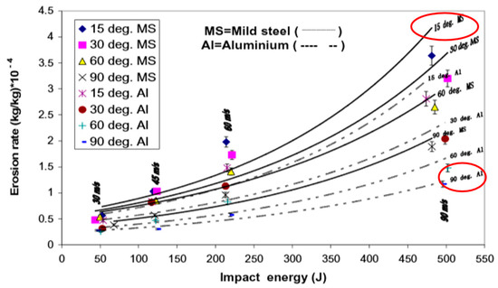 Erosion rate dependency on particle impact energy and angle for mild steel and aluminium. Reproduced with permission from [54]. Elsevier, 2014.