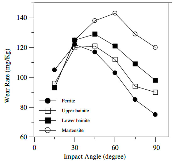 Effect of impact angle on wear rate for four different iron matrices. Reproduced with permission from [55]. Elsevier, 2005.