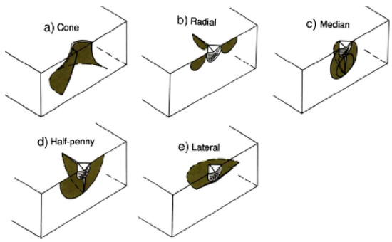 Typical fracture types during indentation of brittle materials, where (a–e) shows the forms of cracks generated on the surface. Reproduced with permission from [31]. Elsevier, 2014.