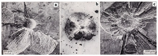 Common impact deformation patterns noticed in the brittle material as a plastic reaction regime, where (a) shows the radial cracking that generated from the central impression and material removal, (b) illustrates a surface crack caused by the lateral fracture, and (c) demonstrates a surface crack caused by lateral fracture and partial removal of the plastic impression as a result of high particle velocity impact on the surface. Reproduced with permission from [70]. The Royal Society (UK), 1978.