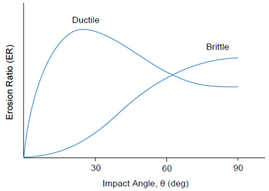 An experimental study [102] has confirmed that the erosion rate for brittle materials increases as the angle of impact increases, see Figure 15, and this leads to significant surface layer deformation. In contrast, at small angles of impact, particle impact causes scratches to the surface, resulting in less surface deformation [102]. Oka et al. [103] have derived an expression relating angle of impact and erosion rate, E, both brittle and ductile materials, see Equation (14):