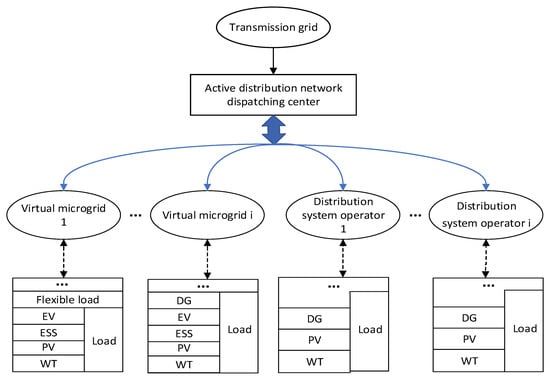 The energy crisis and environmental pollution are factors that promote distributed power generation technology development. Since the gradual increase of distributed power supply penetration and distributed power sources are often placed near the load, the distribution network has the characteristics of dispersion, which brings new challenges to the safe and economic operation of the traditional distribution network. In order to solve the problem of safe operation and active management of high-permeability distributed power supply in distribution networks, active distribution network (ADN) technology has emerged as the time’s requirement. ADN is the power distribution system that actively manages the power supply to the distribution network by actively controlling and dispatching according to the operating state of the power system []. In fact, it is inevitable that new technologies link different parts of the power system, such as the ubiquitous power internet of things (UPIOT) and artificial intelligence [,]. After the sale of the electricity market is liberalized, the electricity sales company with the right to operate the distribution network not only provides distribution services to collect distribution fees, but also participates in transactions as an independent market entity []. In other words, it has both distribution network operation attributes and transaction attributes. As a result, we call it a distribution system operator (DSO). As an independent benefit participant participates in the dispatching of the active distribution network, the distribution operator has independent power generation units and is no longer subject to the unified dispatching of the power grid, which makes the traditional centralized operation economic dispatch no longer suitable for the power grid dispatching []. Consequently, a method suitable for handling the dispatching of multi-stakeholders with high degrees of freedom needs to be found [].