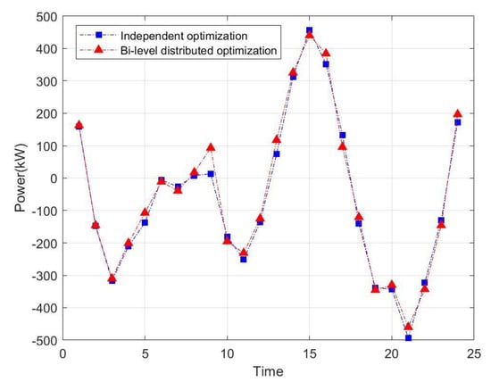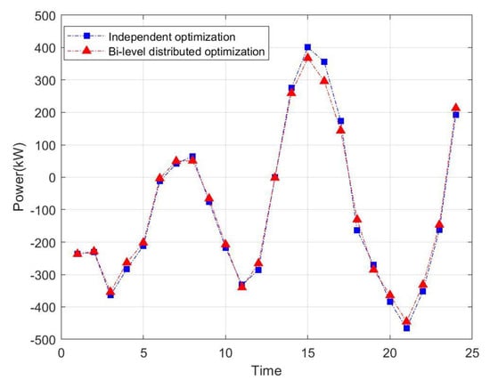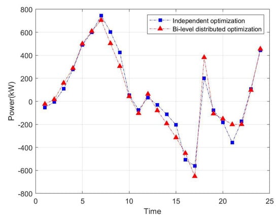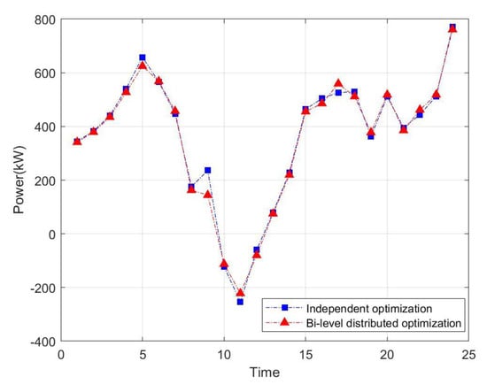 The maximum benefit of each entity of the bi-level distributed dispatching solved by the ADMM and the acceptance of the calculation results of each subject are shown in Table 5. Among them, it is assumed that the power when VMG and DSO purchase power to the grid is positive, and the power when selling power to the grid is negative, and the exchange power in two different optimization modes are shown in Figure 8, Figure 9, Figure 10 and Figure 11. At the same time, the comparison of the total operating cost, network loss and information transmission cost of the entire ADN under two optimization modes are shown in Figure 12.