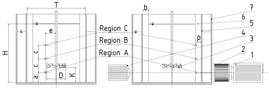 Details about the experimental apparatus are given in our previous papers [,,]. In brief, the experiments were carried out in a cylindrical baffled vessel with a flat bottom. The immiscible liquid–liquid system (distilled water—WACKER AP200 silicone oil) was agitated by a high-shear sawtooth impeller (CVS 69 1038.1 type) with diameter of 100 mm and 18 blades. The blade height was 10 mm. The impeller clearance distance from the bottom of the vessel was 75 mm. The liquid level is equal to inner vessel diameter T = H = 300 mm. The scheme of the experimental apparatus is shown in Figure 1.