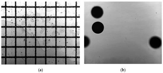 Calibration procedure: (a) Image of 1 × 1 mm grid for evaluation of image resolution captured in Region A. (b) Image with captured calibration Nylon spheres for image analysis (IA) procedure calibration.