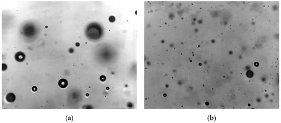 For illustration, the raw images captured at recording time of 5 min at the impeller speeds of 700 and 800 rpm in Region A are shown in Figure 3a,b, respectively. The drop size was evaluated using a pixel shade gradient method based on the determination of the shade gradient between the edge of drops and the background. This approach guarantees the evaluation of drops passing through the plane corresponding to the focus depth used only. The droplets captured outside the focal depth can be responsible for incorrect DSD determination. Using this method, the droplets outside the focus depth used are eliminated. Two parameters are set: (i) threshold value between edge and background, and (ii) the circularity. The changing translucence between the light source and the camera affects background pixel shade during the dispersion process (see Figure 3a,b). Therefore, the threshold was changed during analysis to respect this effect. The second parameter, circularity, enables to identify circular drops only. The captured objects with a value of circularity less than 0.95 were excluded. In this way, the defocused drops can also be eliminated. Finally, the area of an identified drop is evaluated.