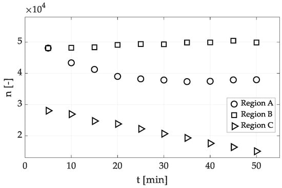 The minimum number of drops that are necessary to evaluate to obtain relevant results must be reached []. The total number of evaluated drops (Table 2) represents the sum of evaluated drops in each region for three impeller speeds and all time-steps, i.e., it represents the sum of evaluated drops from 30,000 captured images. As was expected, the total number of evaluated drops was reached practically the same in regions A and B, which were placed at the same distance below and above the impeller. The number of captured drops was practically stable and greater than 35,000 for each image set, which is more than the minimum number of drops needed to obtain relevant results []. Unlike this, the total number of evaluated drops in the region C was significantly lower, approximately 61% of the number reached in both regions A and B, and decreased with increasing dispersion time, probably due to different hydrodynamic conditions. The time evolution of the number of captured drops is shown in Figure 4 for 600 and 700 rpm impeller speeds respectively, and in Figure 5 for 800 rpm impeller speed. For 700 rpm impeller speed and recording time of 50 min, the drop identification was found to be approximately twice more successful compared with other sets, probably randomly. All factors responsible for this jump were identified.