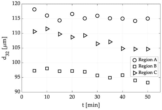 Time evolution of Sauter mean diameter—Effect of the investigated region, 800 rpm impeller speed.