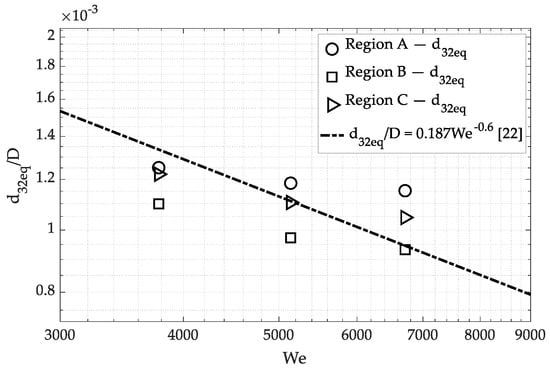 For equilibrium Sauter mean diameters, d32eq, similar trends were found as in the previous case. The smallest d32eq values were determined in region B for all impeller speeds. Compared with this region, the d32eq values in regions A and C were found to be approximately 1.23 and 1.14 times higher, respectively. Based on the Hinze–Kolmogorov theory, the following relation between the ratio of equilibrium Sauter mean diameter, d32eq, the impeller diameter, D, and impeller Weber number, We, can be derived for drop-breaking occurring in the inertial subrange: