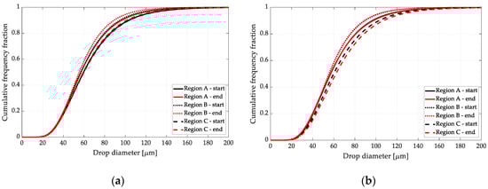 Drop size distribution (DSD) evolution at the start and the end of measurement in each region: (a) 700 rpm impeller speed and (b) 800 rpm impeller speed.