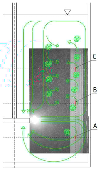 Based on the different results obtained, the flow through the investigated areas was also investigated. The flow field was visualized using FPP-RHB-10 phosphorescent particles (Dantec Dynamics, Denmark) and a lightknife. The light knife was composed using the following components: (i) SCHOTT KL 1500 LCD fiber optic illuminator as a light source, (ii) SCHOTT optic cable, and (iii) SCHOTT AG 12” Lightline-forming light line. Then, sequences of images with a frame rate of 100 fps were recorded by the Phantom VEO-E 310L camera (Dantec Dynamics, Denmark) equipped with a SIGMA 18–35 mm 1.8F DC HSM objective. Flow field measurement was performed for an impeller speed of 700 rpm. Using the captured images, the 4× slow-motion video was created, enabling to visualize flow in the vessel. The significant upper and lower stream loops were identified. The upper stream loop is about twice as long as the lower one. The longer upper current accompanied by forming macro-eddies passing through region C could explain the difference between the number of captured and evaluated drops in this region. The eddies detached from the upper stream loop leaving the impeller discharge zone passed through region B. In this way, the DSD can be affected. The schema of streamlines and investigated areas is shown in Figure 11. The differences in drop size diameters between investigated areas may be further affected by the low pumping of the high-shear sawtooth impeller. The flow visualization was found to be a useful tool for the identification of an eligible location of the investigated area. The investigated area or a sampling point should be placed out of the center of the circulation loops.