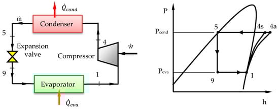 Figure 1 shows a schematic diagram of the VCRC and its corresponding pressure-enthalpy (P-h) diagram. The cycle consists of a compressor, condenser, expansion valve and evaporator. There is no temperature glide for pure and azeotropic mixture refrigerants during condensation and evaporation processes. The different cycle processes can be explained as follows: process (1–4) is a compression through the compressor, process (4–5) is a heat rejection in the condenser, process (5–9) is an expansion through the expansion valve, process (9–1) is a heat addition in the evaporator. The arrangement of the numbers 1–4–5–9 is because of the ones used in the two-stage cycle as will be described in the next subsection.