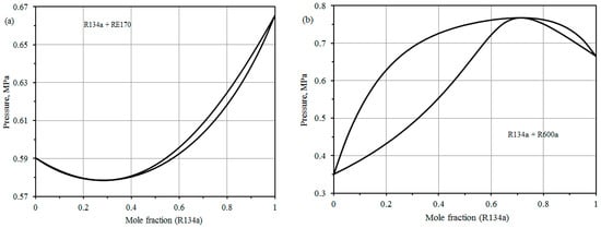 Some results for binary VLE data calculated by BACKONE are displayed in Figure 3 [23]. The mixtures are divided into two categories, i.e., negative azeotrope and positive azeotrope. R134a + RE170 is an example of a distinctive negative azeotropic mixture as shown in Figure 3a. An azeotropic mixture at approximately 30 mole % R134a would be very suitable for an application as a refrigerant. R134a + R600a is an example of a typical positive azeotropic mixture as shown in Figure 3b. The azeotrope is at nearly 72 mole % R134a. The negative and positive azeotropes are depending on negative or positive deviations from Raoult’s law. The mixtures of ethers with HFCs have typically negative deviation from Raoult’s law, while RE170 with the R290 or R600a show positive deviation from Raoult’s law. The negative deviation is attributing to the hydrogen bonding of the ethers. The physical background of BACKONE does not allow hydrogen bonding. However, the different deviations from Raoult’s law are refracted in the parameter k12. Negative k12 yields negative deviations; positive k12 yields positive deviations from Raoult’s law. R125 + R143a is the only mixture without ether which displays a negative deviation from Raoult and it has a negative k12.