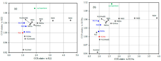 Comparison of the COP and CCR of pure alternative refrigerants relative to R22 (a) and R134a (b).