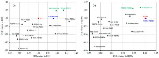Comparison of the COP and CCR of the inspected mixtures relative to R22 (a) and R134a (b).