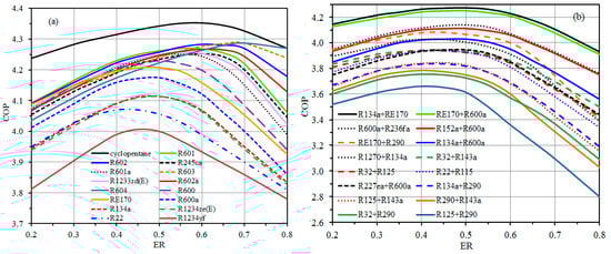 Effect of ER on COP of the TSVCRC using; pure refrigerants (a), and mixed refrigerants (b).