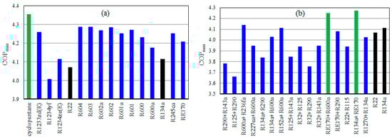 The COPmax of TSVCRC using pure refrigerants (a), and mixed refrigerants (b).