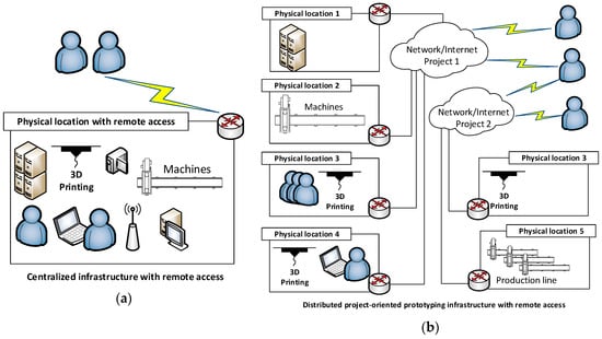 Types of prototyping system architecture: (a) Centralized infrastructure with remote access; (b) Distributed project-oriented prototyping infrastructure with remote access.