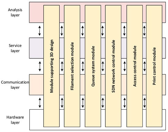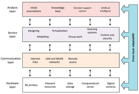 These individual modules apparently belong to single layers of the framework presented earlier. However, in reality, these modules can (but do not have to) use the functionality of all four layers (Figure 4). For example, the 3D design support module uses available hardware resources (including computing power) and access to this module can be done remotely through the communication infrastructure, thereby implementing the design and modeling service for the end-products and, at the same time, working under the initial assumptions and knowledge (the example model reference) from the analysis layer. Similar relations apply to the other modules.