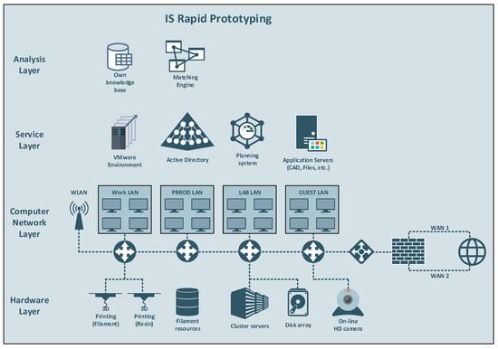 This paper consists of several sections. The second section includes a description of the framework for the design of modern automated and computerized infrastructure. This section presents the main concept and the cross-layer structure of the layers. In section three, the level of IT maturity of the implemented framework is presented, as these levels facilitate the planning and implementation of the framework in terms of its organization and technology. The versatility of this concept allows its use in both homogeneous and heterogeneous environments in terms of ownership and location. Section 4 covers the system architecture of the proposed framework along with the functionality of the individual modules, while Section 5 illustrates the possibility of adopting the proposed architecture in a remote rapid prototyping environment. Section 6 presents an example of the actual implementation of the framework proposed by the authors in cooperation with industry. Section 7 compares the proposed approach with the classic approaches in terms of the actual production costs using three selected Fused Deposition Modeling (FDM) technologies. At the end, the results of the work are summarized, along with the plans for future work and the development of the proposed approach.