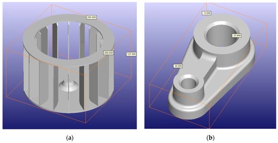 Next, the costs for the prototyping and production of two different (overall and structural) elements were analyzed: a rotor 200 m in diameter and 127 mm height (Figure 8a), as a thin-walled element with a complex geometric structure, and a bracket (Figure 8b), as a small element 50 mm long, 25 mm wide and 13 mm high, designed as a solid prototype.