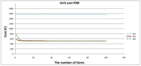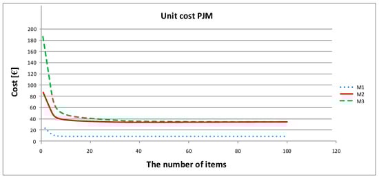 The costs for bracket manufacturing are different because brackets are a compact element with much smaller dimensions than a rotor. Due to the small size of a bracket, it is important to be able to make a few to a dozen pieces in one process. Thus, the most expensive context is the production of a single piece, which is especially notable for processes 2 and 3, for which cost stabilization occurs at 20 pieces of ordered product. For the model of process 1, the cost of execution is the smallest, and the course of the curve is gentle. For the prototype of the bracket, the highest cost was also observed for PJM technology with process 3. However, the difference between the production costs for individual technologies is not very significant in terms of the value itself, especially for over 20 pieces, compared to the rotor production price.